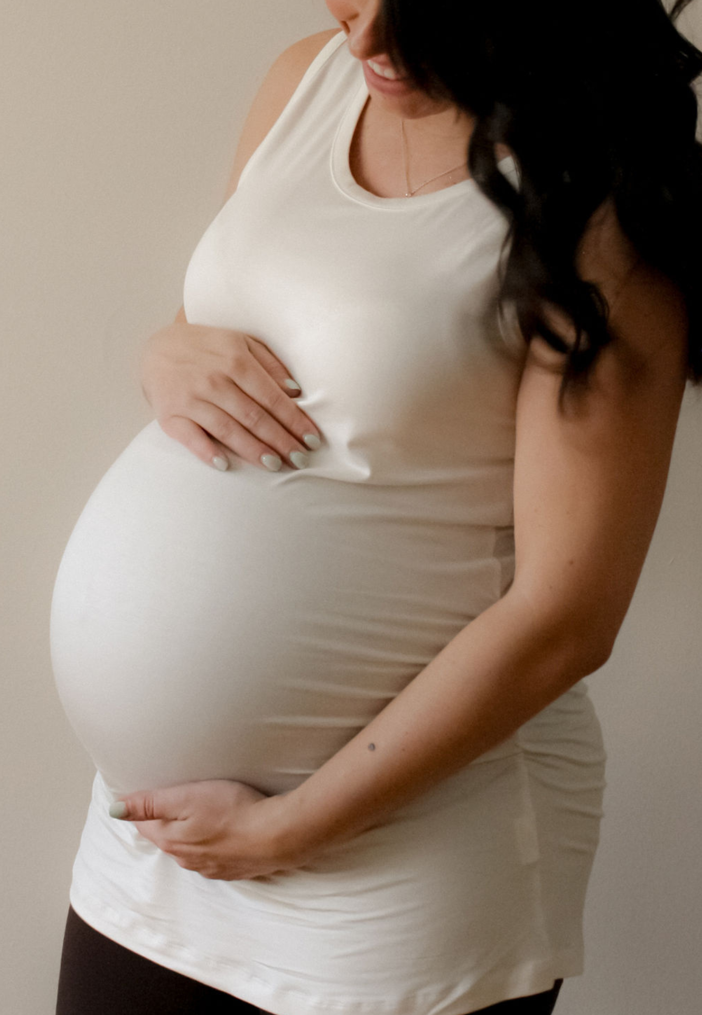 The Indiana Maternity Tank top is a Bamboo/Spandex blend, designed with ruching for your growing baby bump!